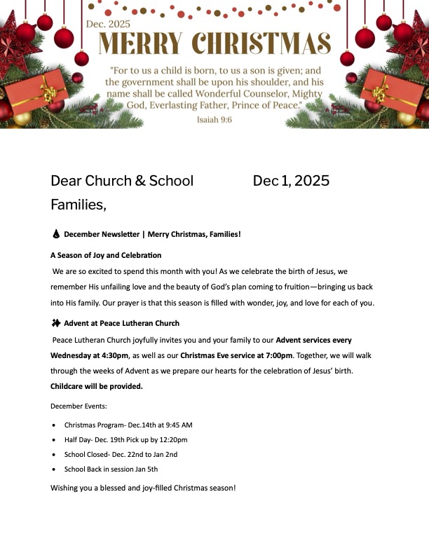 We strive to work as one ministry to walk with you and your family through every step in life. Peace Lutheran Church and School equally support our families, meeting not only your child's academic needs but also supporting your family as a whole. We are here to pray with you, walk with you, and be there for you. We love as one ministry just as we are one body in Christ.
